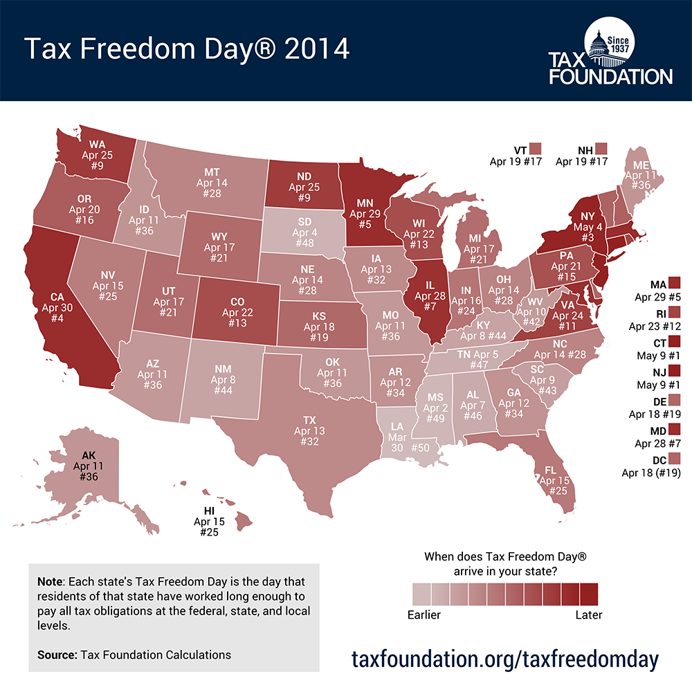 Download Tax Freedom Day 2014 PDF For the most recent version of Tax Freedom Day, please follow this link. What is Tax Freedom Day®? Tax Freedom Day is the day when the nation as a whole has earned enough money to pay its total tax bill for year. A vivid, calendar-based illustration of the cost of government, Tax Freedom Day divides all federal, state, and local taxes by the nation’s income. In 2014, Americans will pay $3.0 trillion in federal taxes and $1.5 trillion in state taxes, for a total tax bill of $4.5 trillion, or 30.2 percent of income. This year, Tax Freedom Day falls on April 21, or 111 days into the year. Why is Tax Freedom Day later this year? Tax Freedom Day is three days later than last year due mainly to the country’s continued slow economic recovery, which is expected to boost tax revenue especially from the corporate, payroll, and individual income tax. When is Tax Freedom Day if you include federal borrowing? Since 2002, federal expenses have exceeded federal revenues, with the budget deficit exceeding $1 trillion annually from 2009 to 2012 and over $800 billion in 2013. In 2014, the deficit will continue to decline to $636 billion. If we include this annual federal borrowing, which represents future taxes owed, Tax Freedom Day would occur on May 6, 15 days later. The latest ever deficit-inclusive Tax Freedom Day occurred during World War II on May 21, 1945. When is my state’s Tax Freedom Day? The total tax burden borne by residents of different states varies considerably due to differing state tax policies and because of the progressivity of the federal tax system. This means a combination of higher-income and higher-tax states celebrate Tax Freedom Day later: Connecticut (May 9), New Jersey (May 9), and New York (May 4). Residents of Louisiana will bear the lowest average tax burden in 2014, with Tax Freedom Day arriving for them on March 30. Also early are Mississippi (April 2) and South Dakota (April 4). How has Tax Freedom Day changed over time? The latest ever Tax Freedom Day was May 1, 2000, meaning Americans paid 33.0 percent of their total income in taxes. A century earlier, in 1900, Americans paid only 5.9 percent of their income in taxes, meaning Tax Freedom Day came on January 22. Who calculates Tax Freedom Day? Tax Foundation economists calculate Tax Freedom Day using federal budget projections, data from the U.S. Census and the Bureau of Economic Analysis, and projections of state and local taxes. Tax Freedom Day was created in 1948 by Florida businessman Dallas Hostetler, who deeded the concept to the Tax Foundation when he retired in 1971. Tax Freedom Day by state has been calculated since 1990, when sufficient data became available. Learn more about Tax Freedom Day at www.taxfoundation.org/taxfreedomday Tax Freedom Day Since 1900 Tax Freedom Day has not always been this late in the year. World War I tax increases led to a jump in Tax Freedom Day from 1917’s January 24 to 1918’s February 8 to 1921’s February 22. In the 1920s, when Justice Oliver Wendell Holmes described taxes as the price of civilized society, Tax Freedom Day was arriving in February. The Great Depression and the Hoover/Roosevelt tax increases led to not only a later Tax Freedom Day but also a shift in who was collecting. In 1932, Americans spent 10 days paying federal taxes and 46 days paying state and local taxes. By 1940, Americans worked 33 days to pay each. World War II brought increased federal spending and borrowing, with Tax Freedom Day arriving in April for the first time in 1943. The federal tax burden never returned to pre-war levels. The 1950s and 1960s also saw a rise in state-local tax burdens and a boost in economic growth following the 1964 Kennedy/Johnson tax cut. Vietnam War-era tax increases and the “stagflation” of the 1970s pushed personal incomes into higher tax brackets, and by 1981, Tax Freedom Day arrived on April 24. The Reagan tax cut signed into law that year ushered in an economic boom; federal revenues grew but the economy grew even faster. Despite pressure on state and local taxes following taxpayer revolts like Proposition 13 in California, the strong economic growth led to increased tax collections, and in 1989, Tax Freedom Day arrived on April 22. That year, federal income tax revenues as a share of the economy were higher than they had been in nearly all years prior, and higher than all but one year (1952) of the 1940s, 1950s, and early 1960s, when the top rate exceeded 90 percent. A string of record-setting federal tax burdens followed, and the latest ever Tax Freedom Day occurred on May 1, 2000. With federal revenue routinely exceeding forecasts, there was strong popular pressure for a major tax cut. The new president delivered on his tax cut promises, which, combined with a recession in 2001, caused the tax burden to fall considerably. In 2003, Tax Freedom Day arrived on April 14, more than two weeks earlier than it had in 2000. Beginning in 2007, stimulus tax cuts and a weakening economy pushed Tax Freedom Day earlier still; in 2009, Tax Freedom Day was on April 10, earlier than any year since Lyndon Johnson was in the White House. This course was reversed in 2013 with tax increases at the federal level and a slowly recovering economy, which pushed Tax Freedom Day to April 18. This year, Tax Freedom Day is April 21, three days later than last year due mainly to the continuing economic recovery, which will boost federal tax revenue collected through the corporate, payroll, and individual income tax. Methodology We count in the denominator every dollar that is officially part of national income according to the Department of Commerce’s Bureau of Economic Analysis. We count in the numerator every payment to the government that is officially considered a tax. Taxes at all levels of government are included, whether levied by Uncle Sam or state and local governments. In calculating Tax Freedom Day for each state, we look at taxes bor